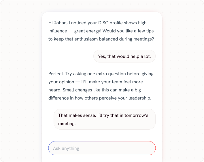 Training and coaching doesn’t stop when the session ends. With QNOMI, every client gets a personal AI coach, trained on their unique profile. This means your clients can keep exploring their strengths, challenges, and growth paths — whenever they need it.